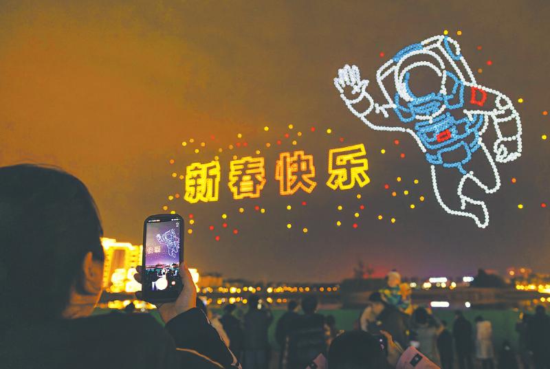 ①1月31日晚,市民在绵阳金西湖用手机拍下精彩的无人机灯光秀。张波 摄(C视觉)