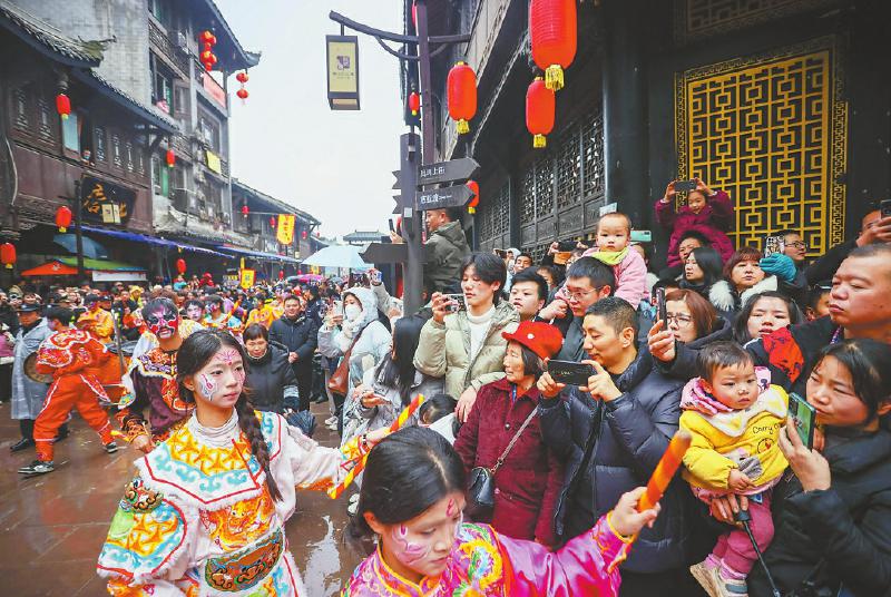 ②2月1日,遂宁市船山区龙凤古镇上演非遗大游演,现场为游客带来非遗代表性项目汕头英歌舞。刘昌松 摄(C视觉)