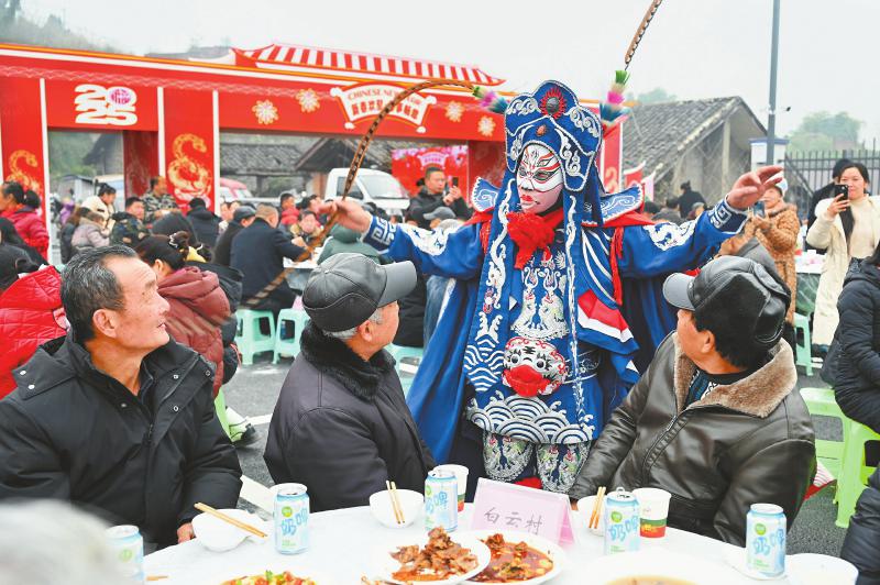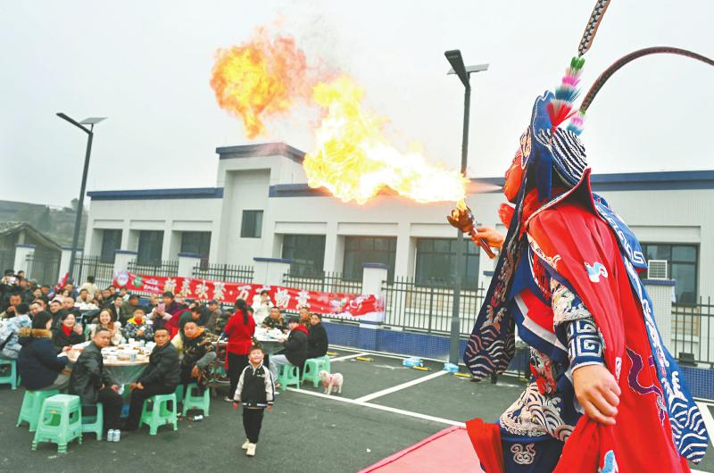 1月23日,内江市东兴区顺河镇天宫社区,川剧演员在“坝坝宴”上表演川剧绝活变脸吐火。趁着农民工返乡过节高峰期,该镇举办特色“坝坝宴”,邀请400余名返乡农民工齐聚一堂赏川剧、叙乡情。 兰自涛 摄(C视觉)