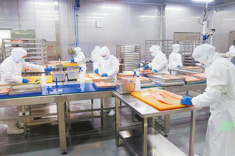 “春节期间,工厂已经‘爆单’了。”西部生鲜港项目经理张栋栋介绍,目前工厂加工的冰鲜三文鱼刺身、料理三文鱼等产品中,80%以上在成都本地销售,最快当天就可摆上商超货架,端上百姓餐桌。