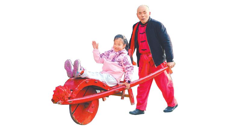 2月4日,孝泉镇德孝广场上,小朋友体验坐鸡公车的乐趣。 唐渝川 摄(C视觉)