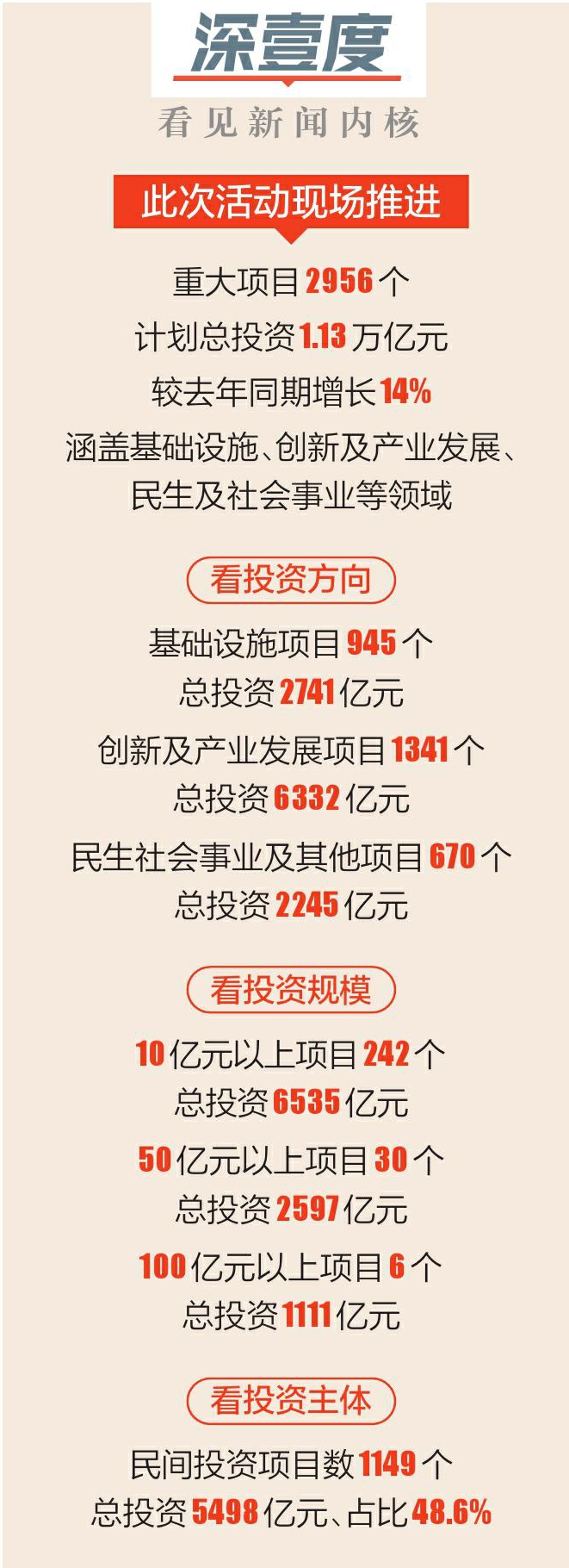 活动推进的基础设施项目945个、创新及产业发展项目1341个、民生社会事业及其他项目670个,总投资分别为2741亿元、6332亿元和2245亿元。