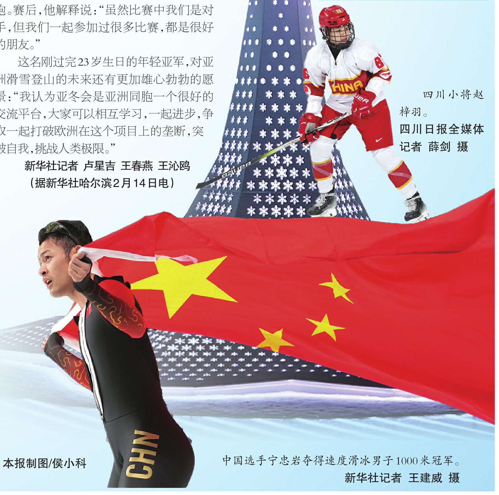 本报讯(四川日报全媒体记者 薛剑发自哈尔滨)2月14日,第九届亚洲冬季运动会迎来最后一个比赛日的争夺。在女子冰球决赛轮最后一轮比赛中,中国女冰1比5不敌日本队,以1胜2负的战绩获得第三名,四川姑娘赵梓羽随队拿到本届亚冬会铜牌。至此,四川运动员在本届亚冬会上拿到1枚金牌1枚银牌2枚铜牌。