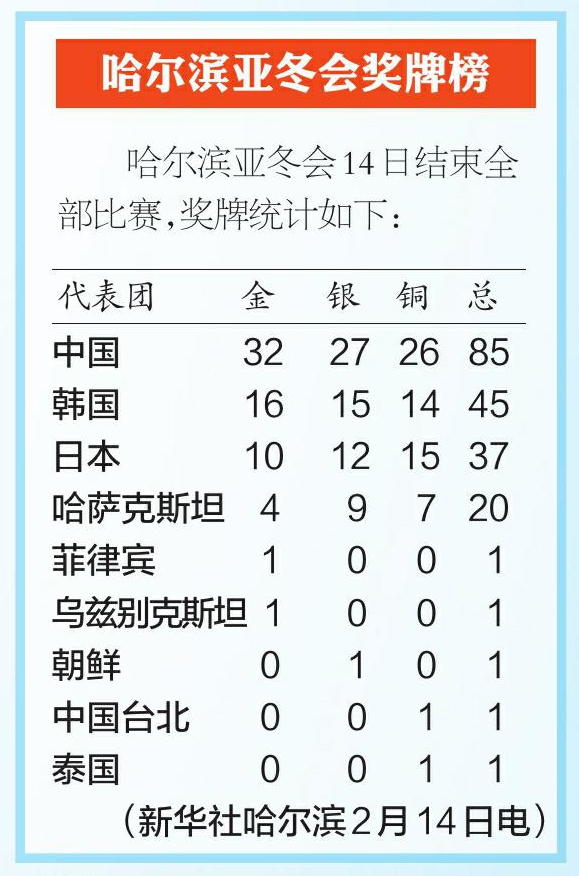 2月14日,第九届亚洲冬季运动会在哈尔滨圆满落幕,中国体育代表团斩获32枚金牌、27枚银牌和26枚铜牌,取得历史最好成绩。这是一次凝聚激情和友谊的亚冬会,在哈尔滨,已然揭开了亚冬会历史新的一页。在这片白山黑水之间,亚洲的冰雪运动迎来更广阔的发展。