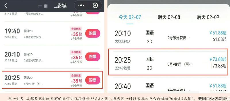 比如同一影片,成都某家影城自有的微信小程序售价35元,第三方平台却标价70余元,平台客服称差价包含服务费,但未明确具体服务内容。