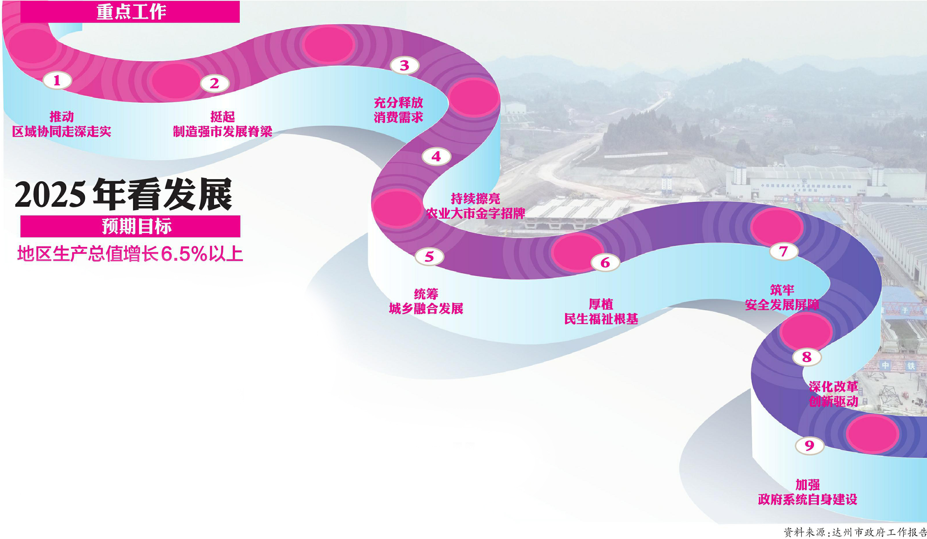 2024年,达州地区生产总值增长5.7%,总量增至2801.6亿元。今年如何冲刺3000亿元大关?达州明确了9个方面的重点工作,从推动区域协同走深走实、挺起制造强市发展脊梁、充分释放消费需求等方面一体发力。