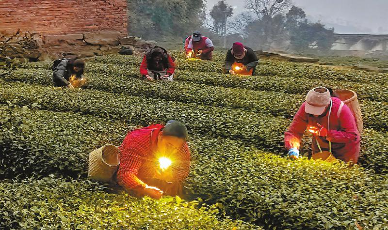 ③2月18日清晨5点多,自贡荣县保华镇大湾村的一处茶园里,茶农正挑灯采摘“峨眉问春”早茶。李秋玥 摄(C视觉)
