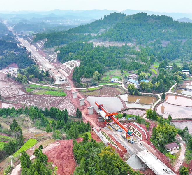 2月11日,位于蓬安县境内的成达万高铁胡家湾大桥施工现场,工人们正在进行箱梁架设作业。 刘永红 摄(C视觉)