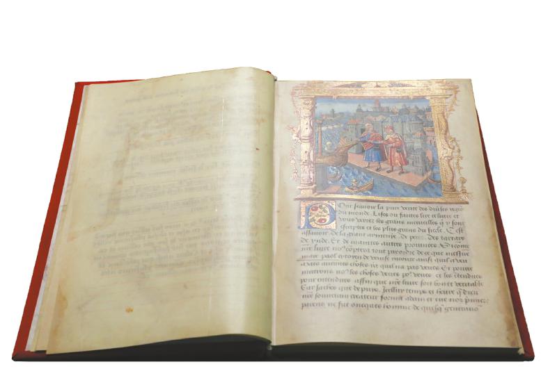 当然,马可·波罗最被关注的还是他口述的《寰宇记》。这本书里,他为西方社会描绘出一幅前所未有的东方画卷。卢钥颖介绍,这本面向市井百姓的白话书大获成功,法国贵族和传教士们也对这本书很感兴趣。此次展出的法国国家图书馆藏阿森纳5219号抄本(复制品)是《寰宇记》的法文译本,这部抄本可能是依据马可·波罗于1306年赠予法国大使的一部副本翻译而成,它在法国贵族圈内流传了两个多世纪。“这些贵族作为图书赞助人对抄本品质要求很高,因而书中常配有丰富精美的系列插图以满足他们的需要。阿森纳5219号抄本便是此类手抄本中的典型代表,它很可能是在1500年左右由法国国王路易十二世的随从制作。”