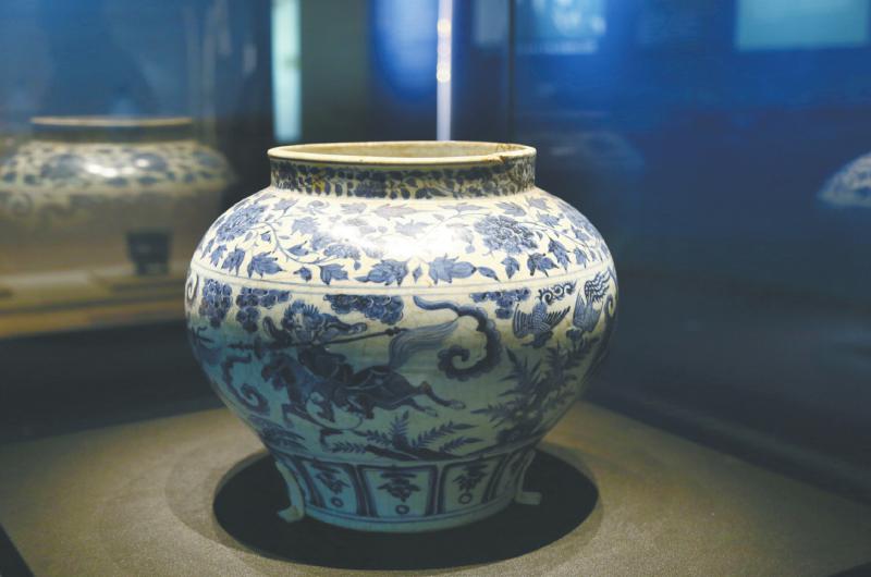 当然,中国的瓷器也通过丝绸之路大量出口到世界各地。以精美蓝色花纹闻名的青花瓷,就是各国人民喜爱的中国商品之一。此次展出的多件元青花中,广西横州市四官岭出土的一件“尉迟恭单鞭救主”图罐堪称重量级展品。这件青花瓷罐保存完好,罐身画作笔触细腻流畅,线条勾勒精准,体现了当时高超的绘画技艺和制瓷水平。福建博物院收藏的德化窑马可·波罗熏香炉,同样展示了中国古代瓷器制作的高超技艺,也见证了德化瓷器通过海上丝绸之路远销欧洲的历史。