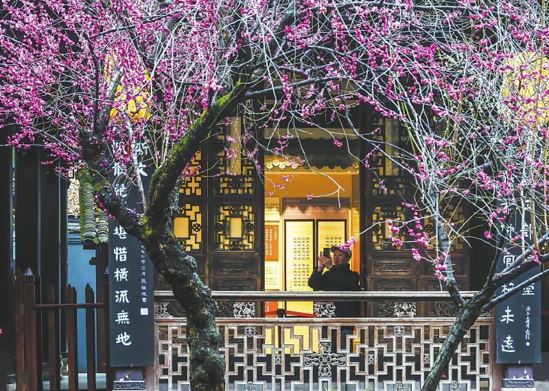 2月19日,成都崇州市罨画池陆游祠放翁堂前红梅开放,在春雨中,穿梭于古建之中赏梅,别有一番韵味。 杨容生 摄(C视觉)