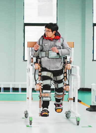 2月13日,在泸州临港经济开发区,四川行走科技有限公司技术人员调试即将出厂的外骨骼康复医疗机器人。