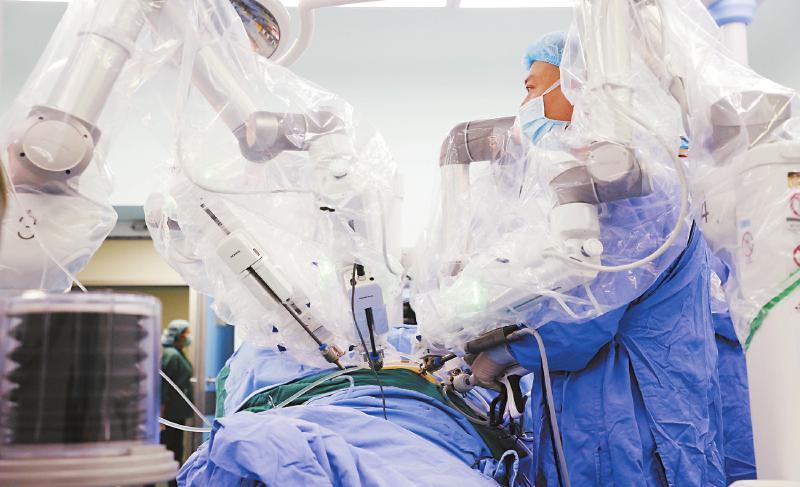 2024年12月6日,在成都市第五人民医院,“成都造”手术机器人成功完成超低位结直肠癌肿瘤切除手术。主刀医生操作4个360度可旋转机械臂,手术出血量仅10毫升。