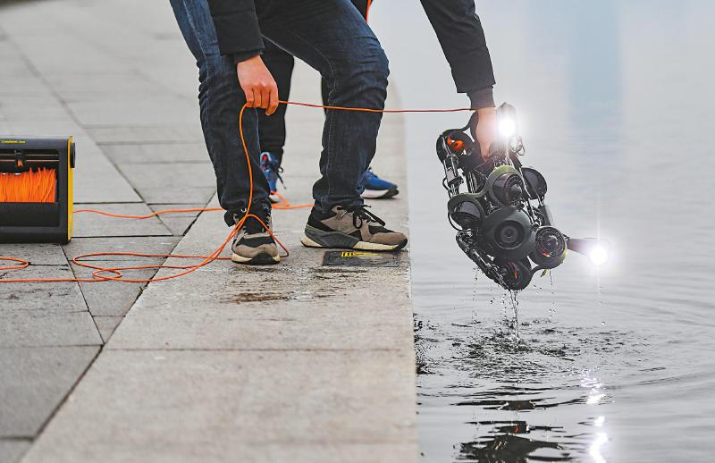 2月21日,四川天府新区潜行创新(成都)机器人科技有限公司工作人员在训练水下机器人设备——潜鲛P200 PRO行业级水下机器人,它可下潜200米执行多种任务。