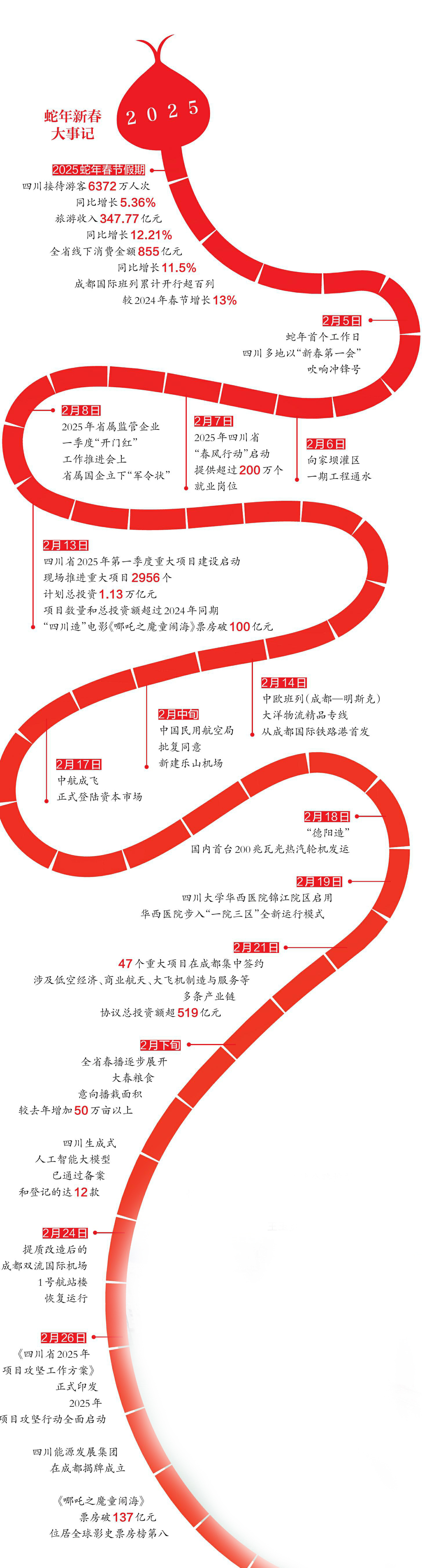 蛇年首月,“四川造”电影《哪吒之魔童闹海》冲到全球影史票房榜第八。“若前方无路,我便踏出一条路”的哪吒,以势不可挡的票房成绩,串联起四川文旅消费“热辣滚烫”的蛇年气象。