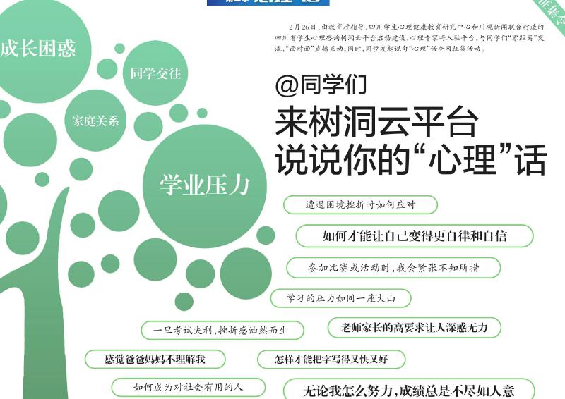 2月26日,由教育厅指导,四川学生心理健康教育研究中心和川观新闻联合打造的四川省学生心理咨询树洞云平台启动建设,心理专家将入驻平台,与同学们“零距离”交流,“面对面”直播互动。同时,同步发起说句“心理”话全网征集活动。