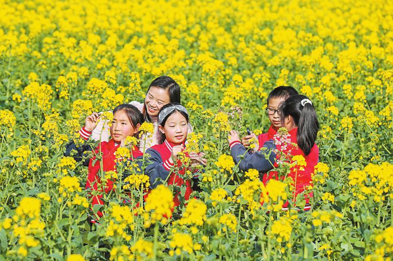 2月26日,在宜宾市高县庆岭镇粮油现代农业园区,老师带着学生在油菜花丛中观察花朵的形态特征。当日,高县团委组织庆岭镇中心小学校学生来到油菜花丛中,让学生通过赏花、探花、识花等方式,了解油菜花的形态特征,用画笔勾勒出心中的春天,感受春回大地的自然之美。庄歌尔 摄(C视觉)