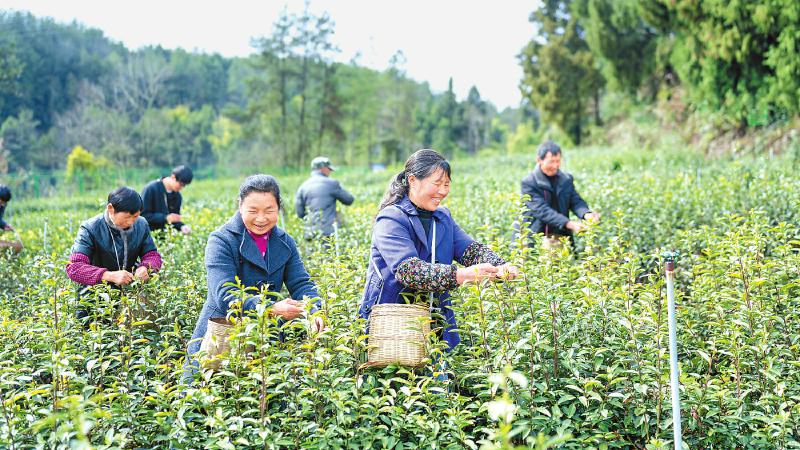 3月3日,旺苍县木门镇三合村的旺苍县茶叶现代农业园区里,茶农穿梭在翠绿的茶树间,采摘早春的第一波新茶。该县现有茶园面积25万亩,预计今年总产量突破9200吨,综合产值78亿元左右。 陈加普 摄