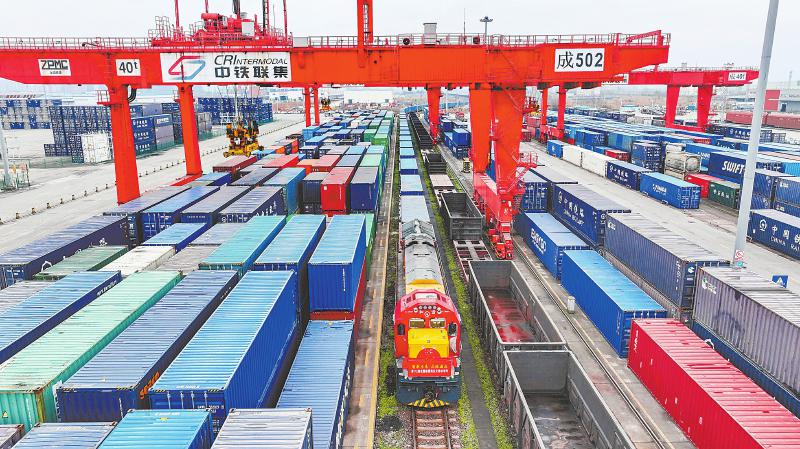 3月7日,一列始发自荷兰蒂尔堡的“糖酒会专列”载着德国葡萄酒、法国奶酪、比利时巧克力、荷兰奶粉等100余种进口商品,缓缓驶入成都国际铁路港。 白桂斌 摄(C视觉)(相关报道见02版)