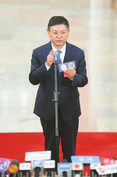 8日,在十四届全国人大三次会议第二场“部长通道”上,生态环境部部长黄润秋用两块从北京市大气环境监测仪上取下的滤膜,展示我国环境改善成果。