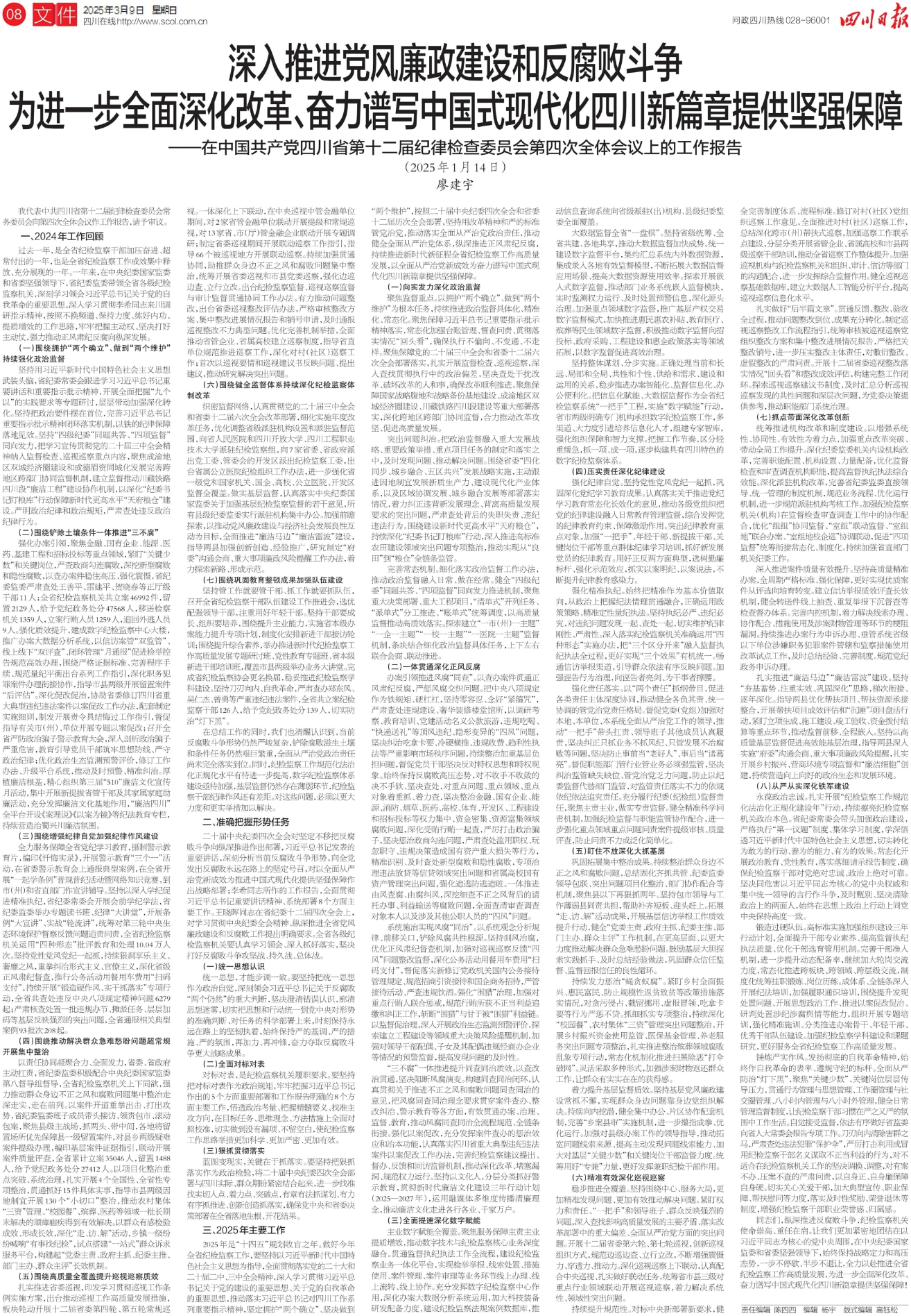 2025年是“十四五”规划收官之年。做好今年全省纪检监察工作,要坚持以习近平新时代中国特色社会主义思想为指导,全面贯彻落实党的二十大和二十届二中、三中全会精神,深入学习贯彻习近平总书记关于党的建设的重要思想、关于党的自我革命的重要思想,推动落实习近平总书记对四川工作系列重要指示精神,坚定拥护“两个确立”、坚决做到“两个维护”,按照二十届中央纪委四次全会和省委十二届历次全会部署,坚持用改革精神和严的标准管党治党,推动落实全面从严治党政治责任,推动健全全面从严治党体系,纵深推进正风肃纪反腐,持续推进新时代新征程全省纪检监察工作高质量发展,以全面从严治党新成效为奋力谱写中国式现代化四川新篇章提供坚强保障。