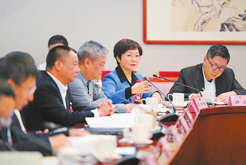 三月九日,十四届全国人大三次会议四川代表团在驻地举行小组会议。欧阳梅代表(右二)就加大普惠托育力度发言。川报集团特派记者 欧阳杰 摄