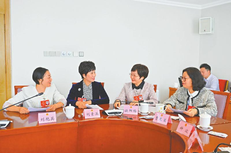 刘艳英代表、刘素英代表、欧阳梅代表、曹天兰代表(从左至右)交流履职心得。