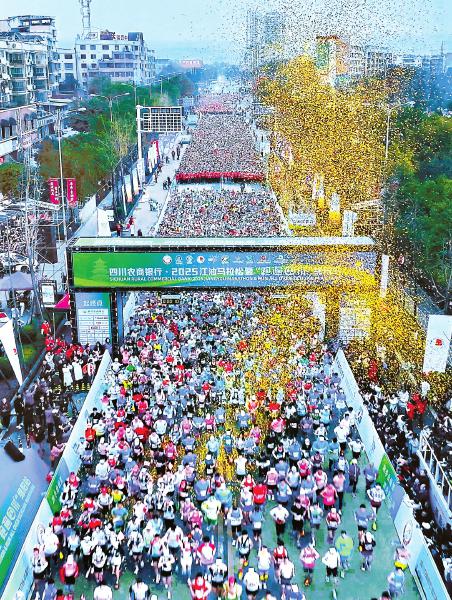 3月2日,四川农商银行·2025江油马拉松暨“跑遍四川”绵阳站鸣枪开赛。本次赛事设有全程马拉松、半程马拉松、欢乐跑三个组别,赛程途经第二涪江大桥、诗仙路、李白大道、江油高新区、中国酱文化博览园等地标景点,吸引超10000名选手参赛。图为起跑瞬间。江油市委宣传部供图
