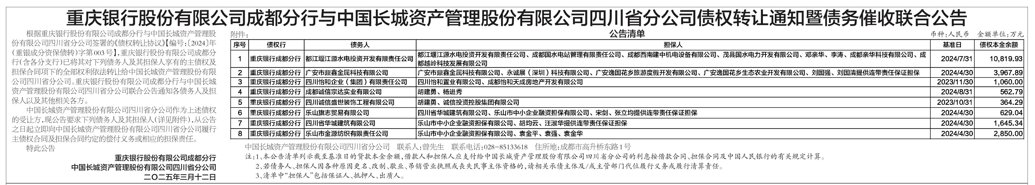 • 重庆银行股份有限公司成都分行与中国长城资产管理股份有限公司四川省分公司债权转让通知暨债务催收联合公告