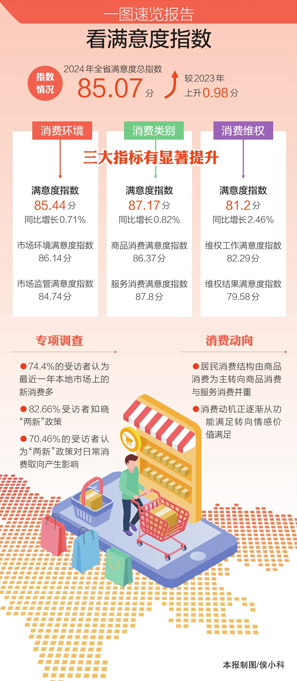 调查显示,消费升级动能强劲,服务创新驱动增长。2024年消费类别满意度指数87.17分,同比增长0.82%,为十年最高。两个二级调查指标中,商品消费满意度指数86.37分,服务消费满意度指数87.8分。服务类别满意度指数连续十年保持增长,2024年较2015年增长11.5分。这说明,服务消费扩容提质,全省消费结构升级态势明显。