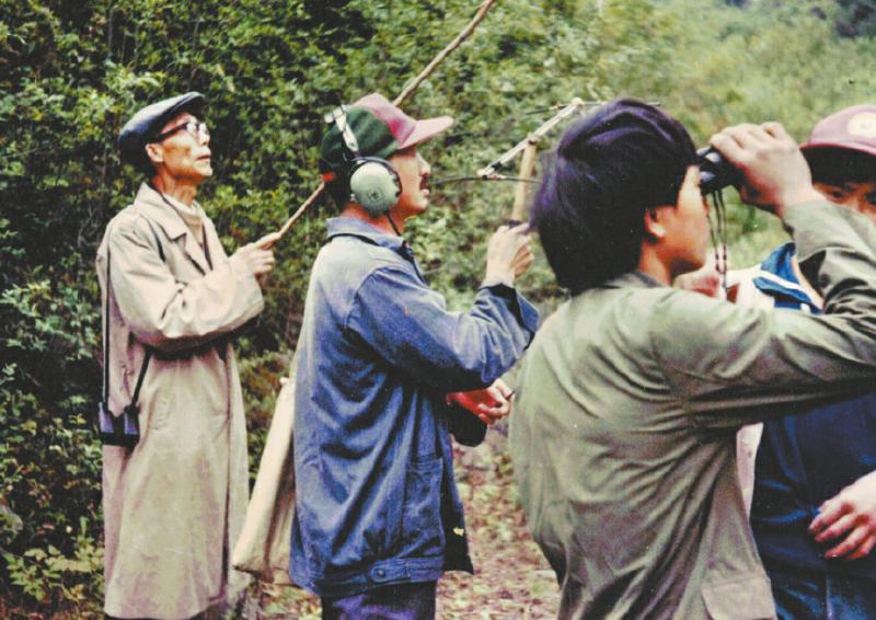 1985年,陈能文(左一)在野外观察站观察大熊猫活动。 陈能文供图