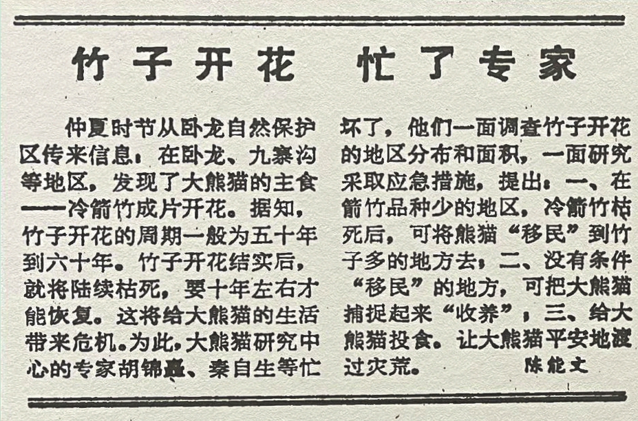 此外,陈能文结合1975年岷山竹子开花抢救大熊猫的经验,并综合整理专家们的意见,在《四川日报》公开提出关于投食、移民、圈养等3条应急措施。