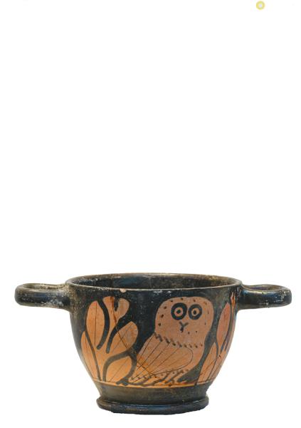 雅典娜的形象庄重而威严,象征着智慧与力量的完美融合。展品中,一件描绘雅典娜乘坐翼马战车场景的红绘柱耳型调酒缸,突显了她作为战争女神的属性;而展墙上雅典娜将花环赐予陶瓶画师的情景,则彰显了她作为技艺之神的另一面——她将纺织、制陶、造船等生存智慧传授给人类,将神性融入日常劳作之中。
