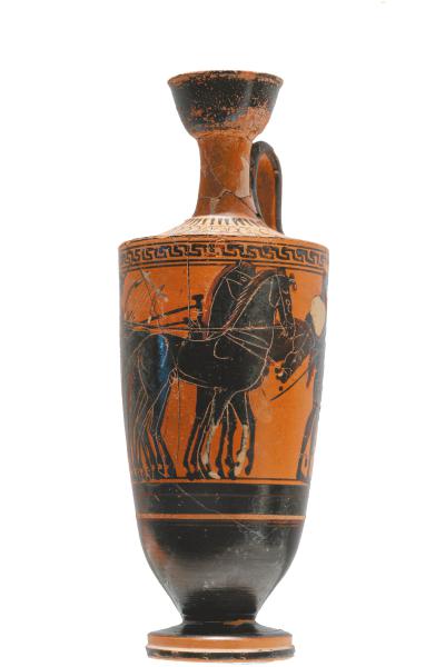 展区尽头,竞技主题的展品呼应着赫拉克勒斯的另一重身份——古代奥运会的创始人。一只阿提卡式红绘双耳杯,描绘了一名运动员拍球的场景;一件卢坎尼亚式红绘调酒缸上,则展现了运动员抵达赛道终点的情景。