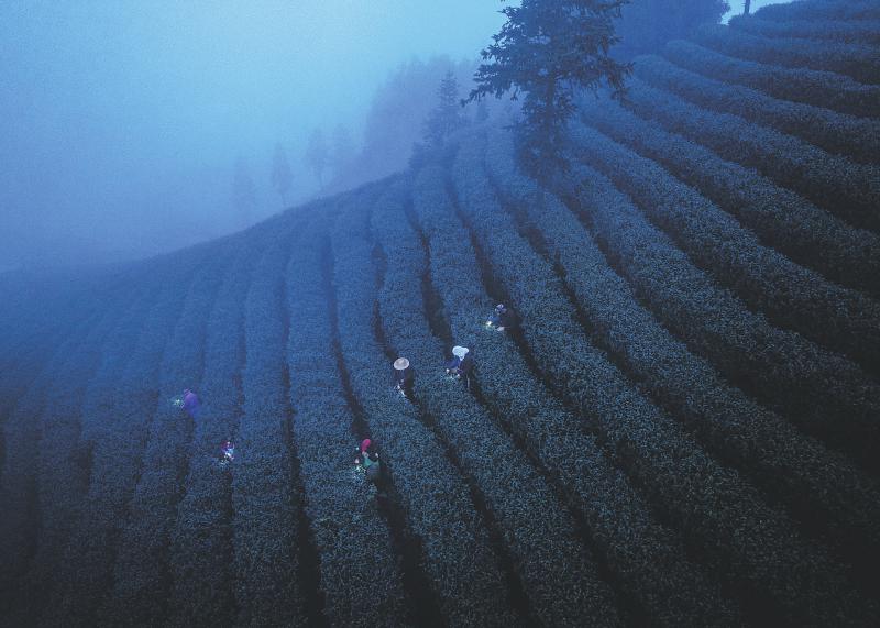 3月13日清晨,泸州市纳溪区打古镇普照村,云雾缭绕。天还未亮,茶农们就已戴上头灯,腰间挎着竹篓,三五成群地在茶垄间穿梭。他们双手在茶树间轻盈地舞动,一捏、一提、一放,翠绿的嫩芽便如雨点般落入竹篓。头灯闪烁的光亮与忙碌的身影,共同构成了一幅茶园劳作画卷。普照村地处乌蒙山区,气候湿润,昼夜温差大,得天独厚的地理环境使得特早茶的种植成了村里的支柱产业。最近气温逐渐升高,茶芽生长速度加快。为了抢摘最新鲜的茶芽,茶农们会在清晨戴上头灯,踏着露水走进茶园。