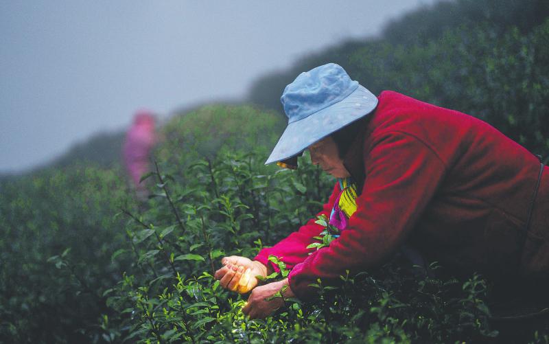 3月13日,泸州市纳溪区打古镇普照村的茶农在头灯的帮助下“掐尖尖”。