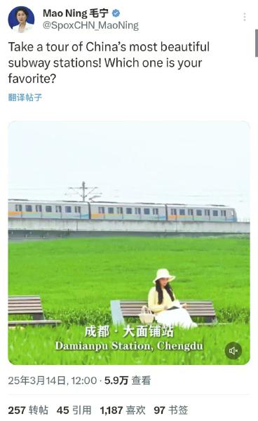 3月14日、15日,外交部发言人毛宁在社交平台上发布了两段视频,推介中国地铁站、机场,邀请外国游客来中国走走看看。