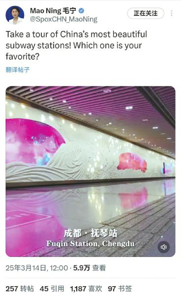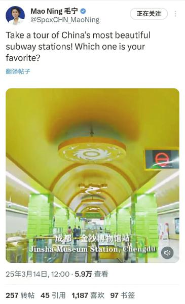 在“中国最美地铁站”视频中,毛宁点赞了包括成都地铁金沙博物馆站、抚琴站、大面铺站在内的全国13座地铁站。另外一段视频则展示了全国8个国际机场,其中包括成都双流国际机场、成都天府国际机场。