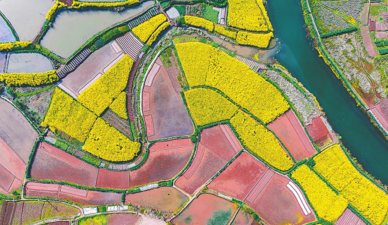 3月23日拍摄的资阳市安岳县岳阳镇凤型村农田。村民们整理的水稻育苗秧田和油菜花田形成了一道春日美景。张天富 摄(C视觉)