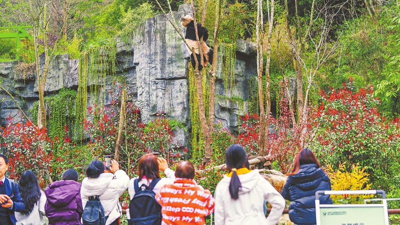 3月22日,在都江堰市熊猫谷,一只爬上树的大熊猫不断变换身姿,仿佛在炫耀爬树技能,引来游客围观。 李旭 摄(C视觉)