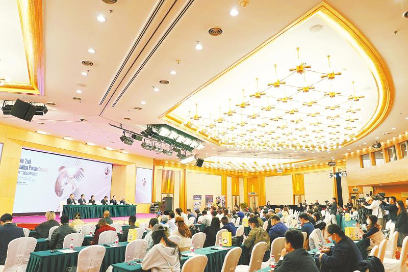 印有金熊猫奖标识的圆珠笔、泛着玫瑰金色彩的稿纸、金熊猫奖特色文创展示区……3月25日,北京梅地亚中心,第二届金熊猫奖新闻发布会现场,金色成为会场的主题色。
