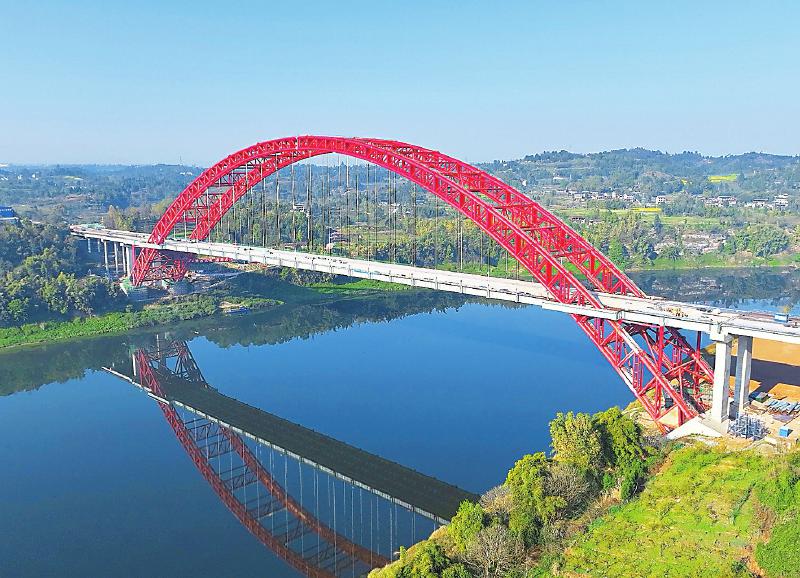 白马渠江特大桥是镇广高速通广段的控制性工程,大桥主桥采用“一跨过江”的中承式钢管混凝土拱桥设计,全长约657.8米,净跨径390米。其钢管拱呈鲜艳的“中国红”,共分36个节段,最大节段的重量达151吨、长度为32米。施工中,建设团队创新钢管拱运输及翻身工艺,采用全装配化缆索吊装系统。钢管拱节段先卧拼、卧运,再用特制平车移至吊装处,然后利用缆索吊装系统使钢管拱在空中完成精确拼装。