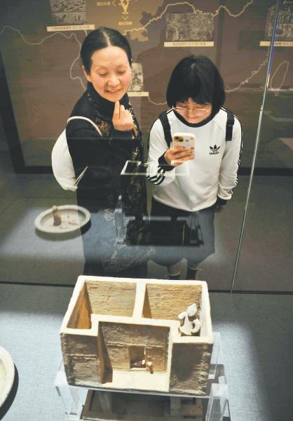3月25日,游客在南充市博物馆嘉陵长歌展厅观看陶房干栏式含陶俑。这件文物高60厘米、宽50厘米,因陶俑头部神似日本影视形象“奥特曼”,吸引众多游客专程带孩子前来打卡。 余中华 摄(C视觉)
