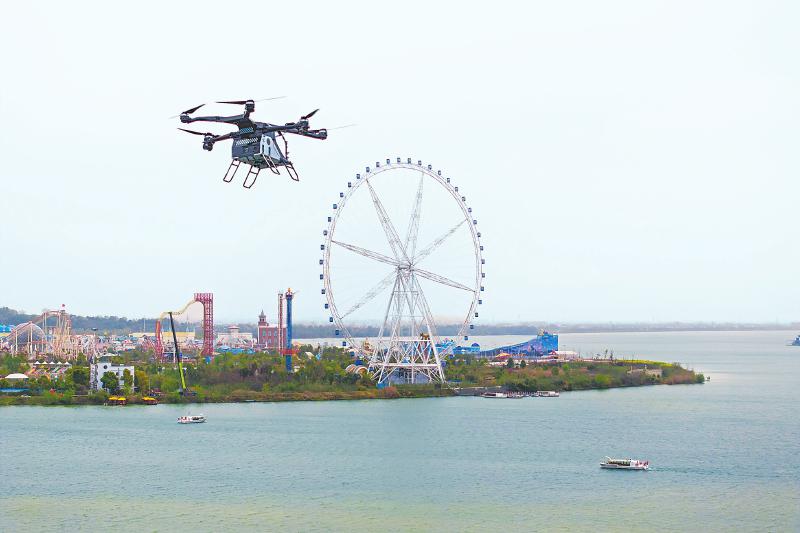 3月27日,小鹏汇天“陆地航母”飞行汽车飞行体在常德柳叶湖旅游度假区进行飞行演示(无人机照片)。“陆地航母”是最新一代分体式飞行汽车,由陆行体和飞行体两部分组成。新华社记者 陈思汗 摄