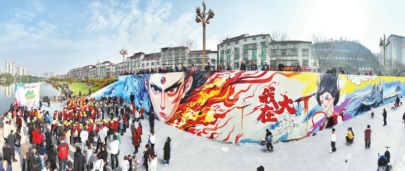 3月23日,大英县首届“千人涂鸦艺术汇”活动在该县郪江湿地公园举行。400余平方米的涂鸦墙上,艺术爱好者挥洒创意,传统神话与当地文化碰撞出奇妙火花。不仅有近期热映的《哪吒之魔童闹海》中的哪吒、敖丙、敖光等经典角色,也有大英县的中国死海旅游度假区、卓筒井、丝路奇幻城等著名景点,意在擦亮大英县“天府旅游名县”文旅名片。张昌明 摄