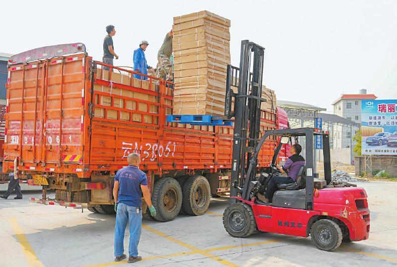 3月29日,工人在瑞丽市一处仓库将支援缅甸灾区的帐篷装车。 新华社记者 陈欣波 摄