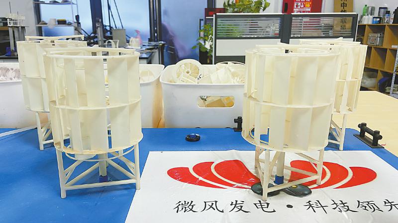 一走进公司大厅,产品展示区里几套低风速垂直轴发电机组3D打印模型十分显眼。只见“矮胖型身材”机组上有2层装有叶片的滚筒结构,“高瘦型身材”机组上则有4层装有叶片的滚筒结构。记者上手触碰,叶片可以开合,滚筒能够旋转。