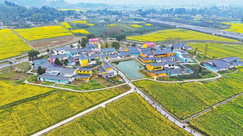 近日,夹江县新场镇“天府粮仓·夹江稻油轮作基地‘因美景’出圈”。在这里,一千二百亩油菜花竞相绽放,彩色房子和花田相得益彰。夹江县委宣传部供图