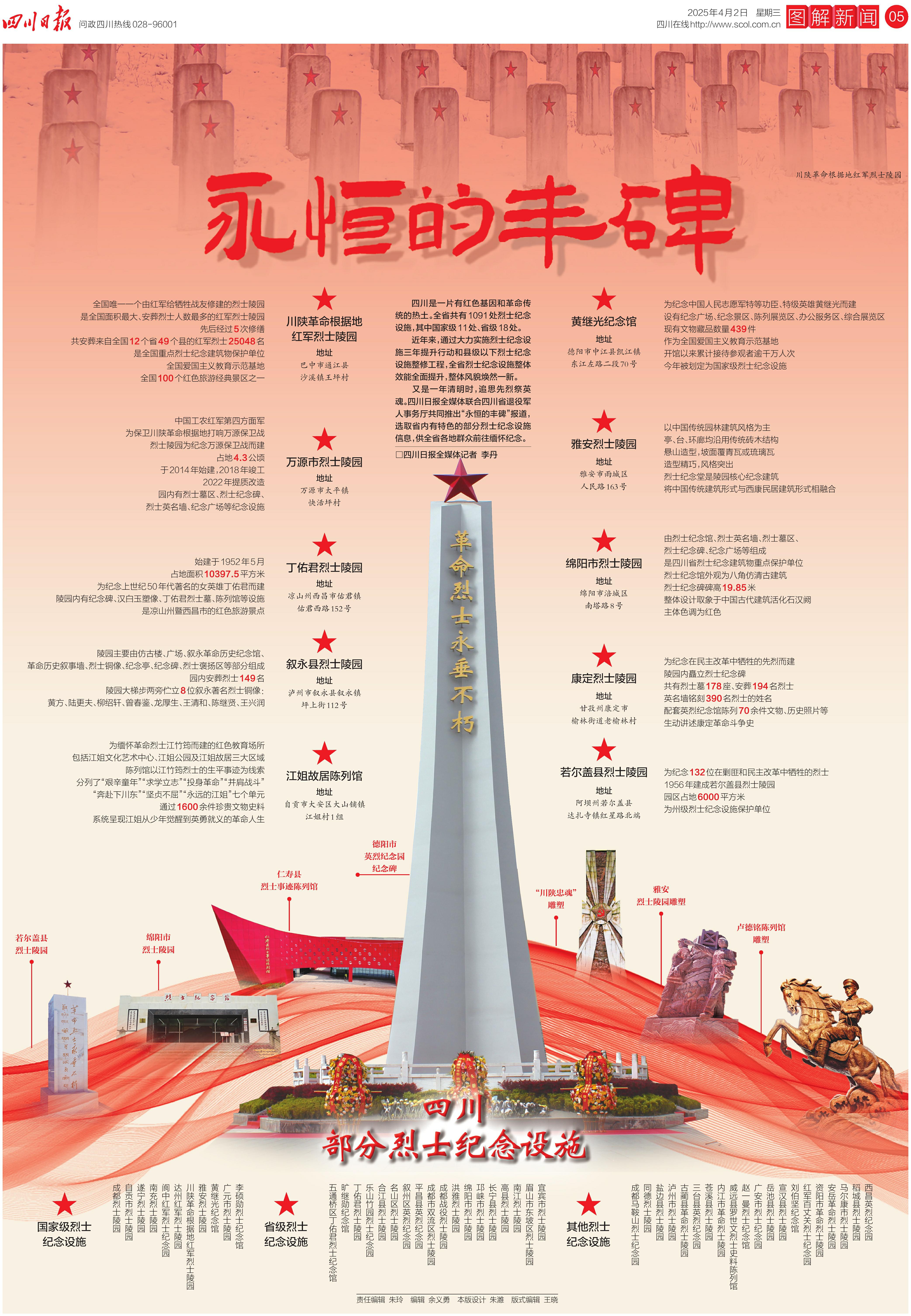 又是一年清明时,追思先烈祭英魂。四川日报全媒体联合四川省退役军人事务厅共同推出“永恒的丰碑”报道,选取省内有特色的部分烈士纪念设施信息,供全省各地群众前往缅怀纪念。