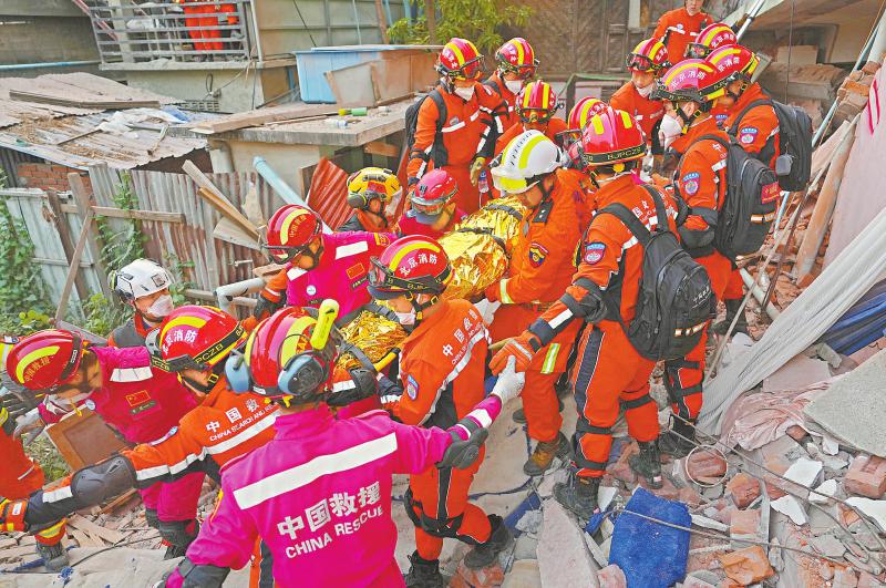 4月2日,在缅甸曼德勒,中国救援队伍救出一名幸存者。据缅甸广播电视台2日消息,缅甸强震目前已造成3003人死亡、4515人受伤,另有351人失踪。 新华社记者 才扬 摄